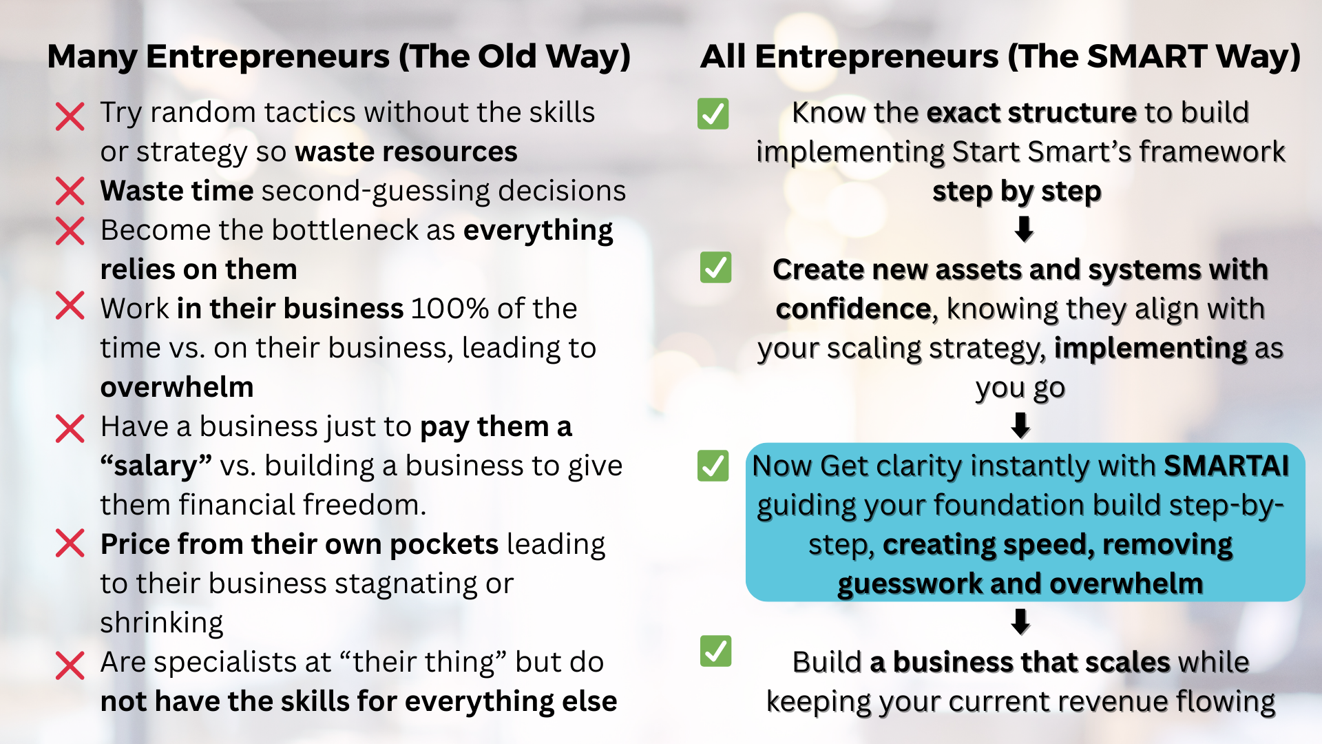 Start Smart created the proven pathway.  SMARTAI makes moving through it faster, easier, and far more achievable, especially for entrepreneurs who have been carrying everything alone.